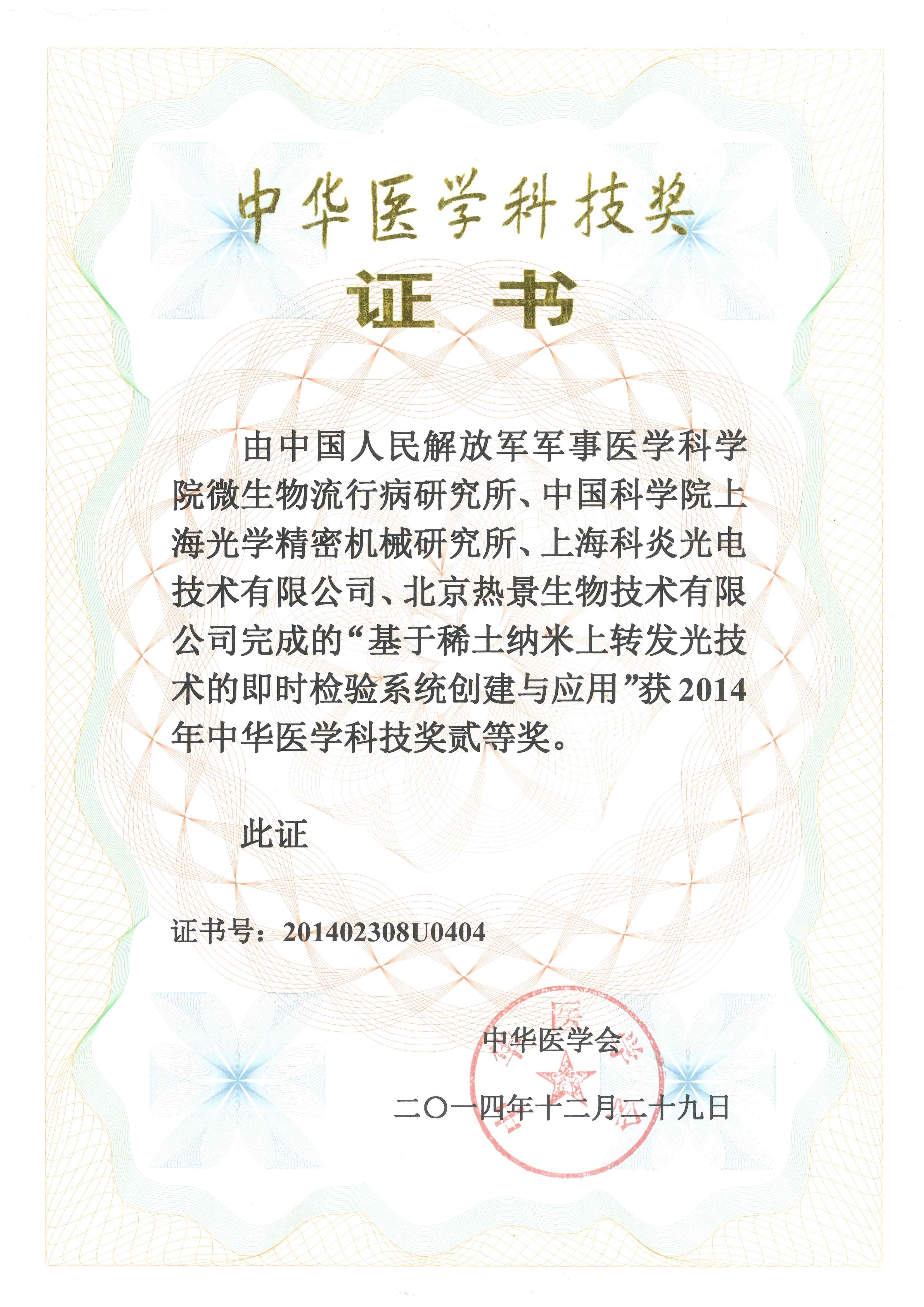 由北京热景生物技术有限公司参与完成的“基于稀土纳米上转发光技术的即时检验系统创新与应用”荣获2014年中华医学科技奖贰等奖。