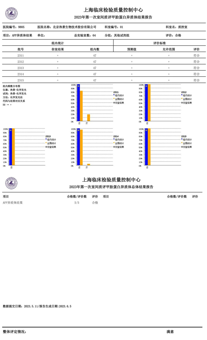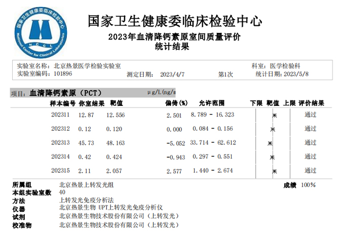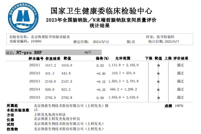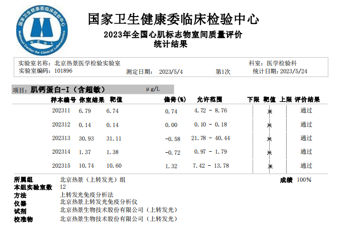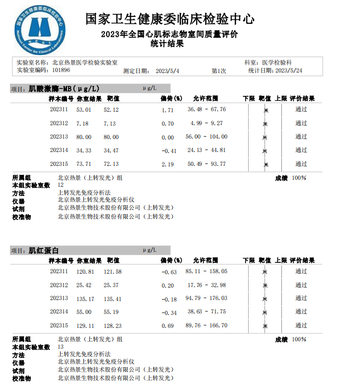 近日,国家卫生健康委临床检验中心(NCCL)公布了2023年多项全国临床检验室间质量评价结果。热景生物旗下热景医学检验实验室以100分的优异成绩通过“胃蛋白酶原”“血清降钙素原”“N末端前脑钠肽”“心肌标志物”等室间质评项目。同时,热景生物参与的上海市临床检验中心2023年第一次能力验证项目,包括B型钠尿肽/N端-B型钠尿肽前体、AFP异质体比率、肌钙蛋白I、降钙素原等项目均通过验证,充分彰显了热景生物稳定可靠的实验室质量管理和检测能力,以及强大的产品和技术实力!