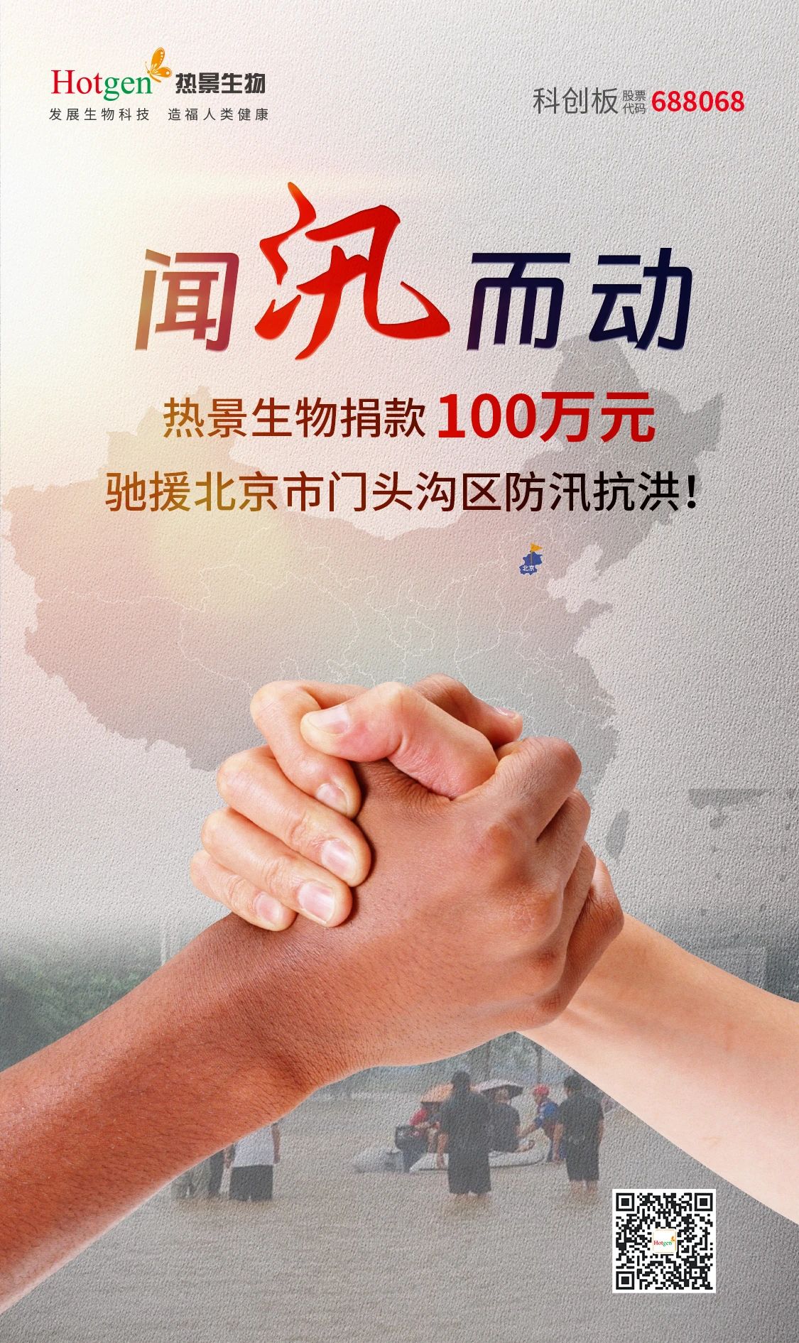 热景生物一直密切关注着汛情救援进展,主动联系相关部门提供支援帮助,并向北京市门头沟区红十字会捐赠100万元防汛抗洪资金,助力当地政府和社会力量抗击灾情。