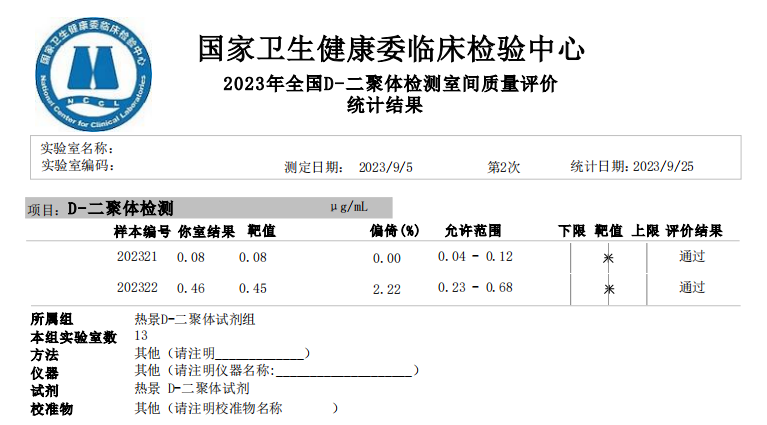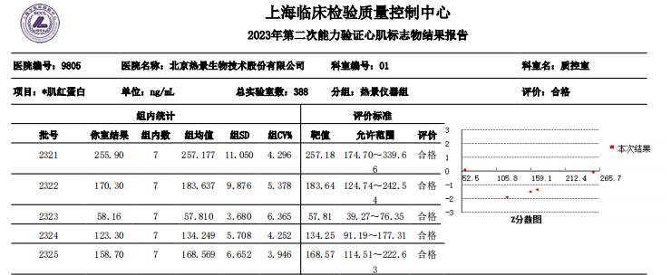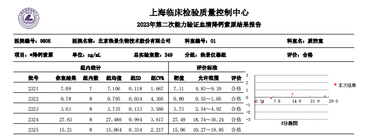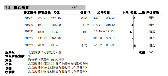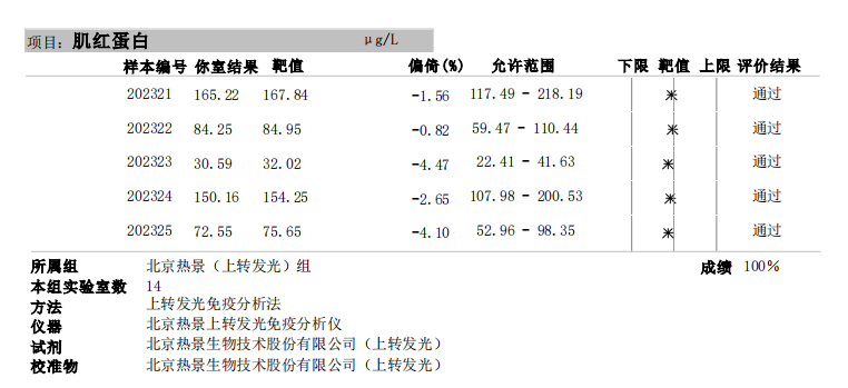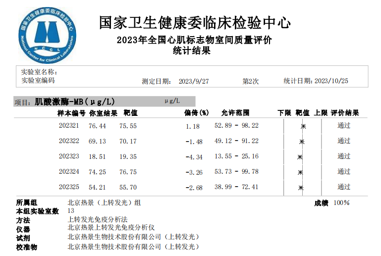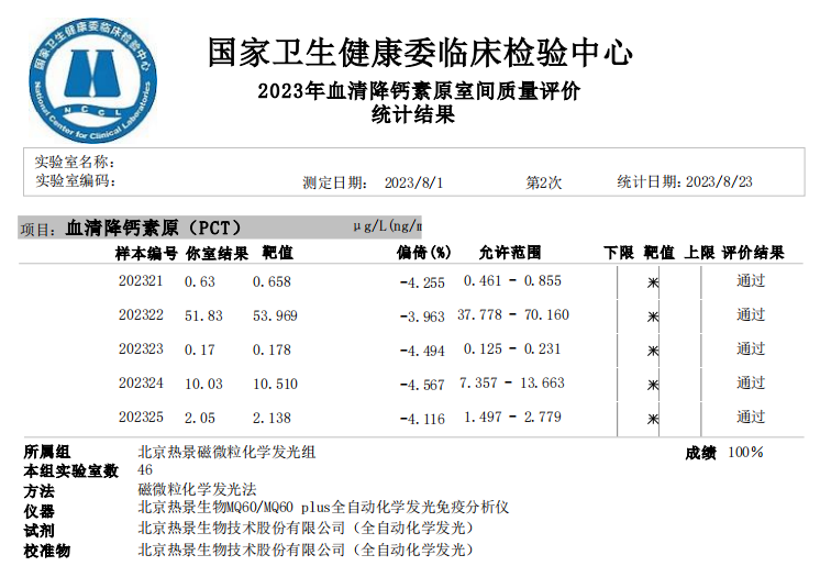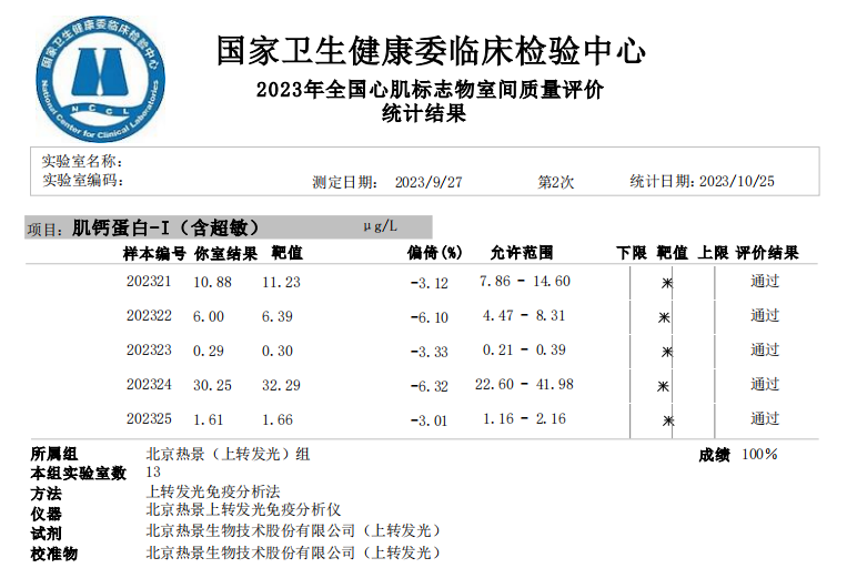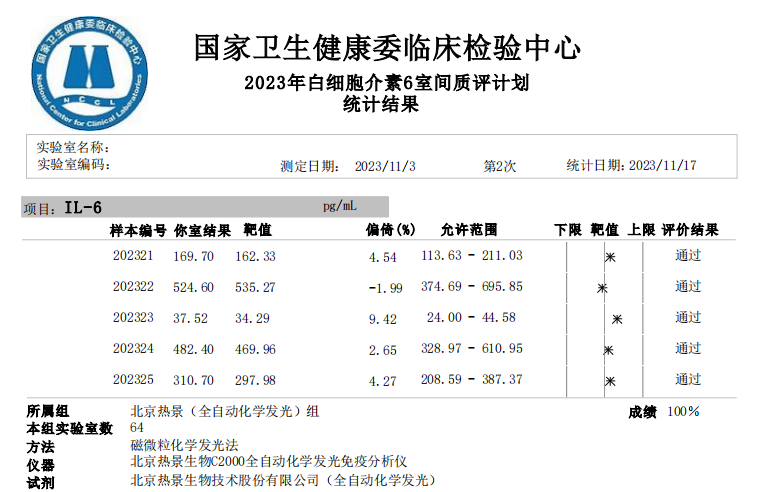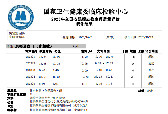 近日,国家卫生健康委临床检验中心(NCCL)公布了2023年第二次全国临床检验室间质量评价结果。经了解,热景生物心肌标志物(肌酸激酶同工酶、肌红蛋白、肌钙蛋白I)、血清降钙素原项目的上转发光及化学发光两大平台产品,以及D-二聚体、白介素6、胃蛋白酶原项目的化学发光平台产品均满分通过此次室间质量评价。同时,热景生物参与的上海临床检验中心2023年第二次能力验证活动,包括AFP异质体比率、B型钠尿肽/N末端B型钠尿肽前体、心肌标志物(肌酸激酶同工酶、肌红蛋白、肌钙蛋白I)、血清降钙素原等项目在内的产品均通过评价。