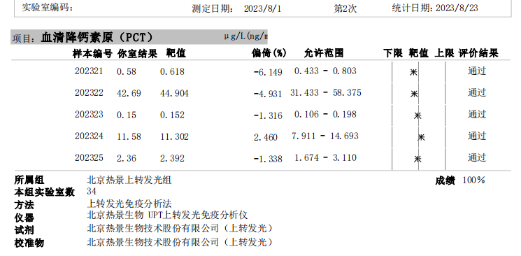 血清降钙素原(PCT)室间质评成绩单(UPT、CLIA平台)