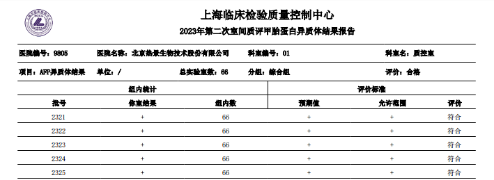 临床检验中心室间质量评价的结果可以反映出实验室管理水平和检测结果的准确性、可靠性和稳定性,而准确可靠的检测结果对患者的疾病诊断、治疗和预后判断都会产生直接影响。此次国家卫生健康委临床检验中心和上海临床检验中心组织的室间质评活动均通过质量评价,充分彰显了热景生物强大的产品以及技术实力。
