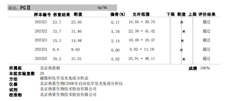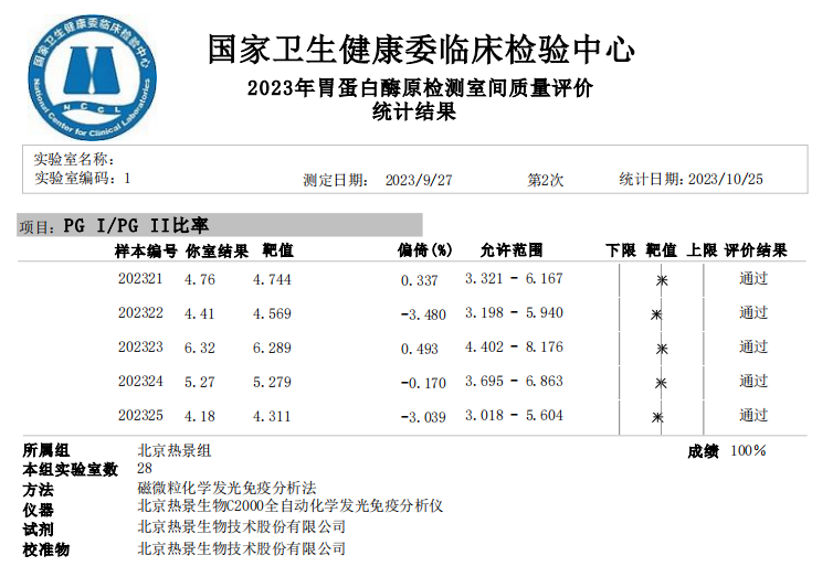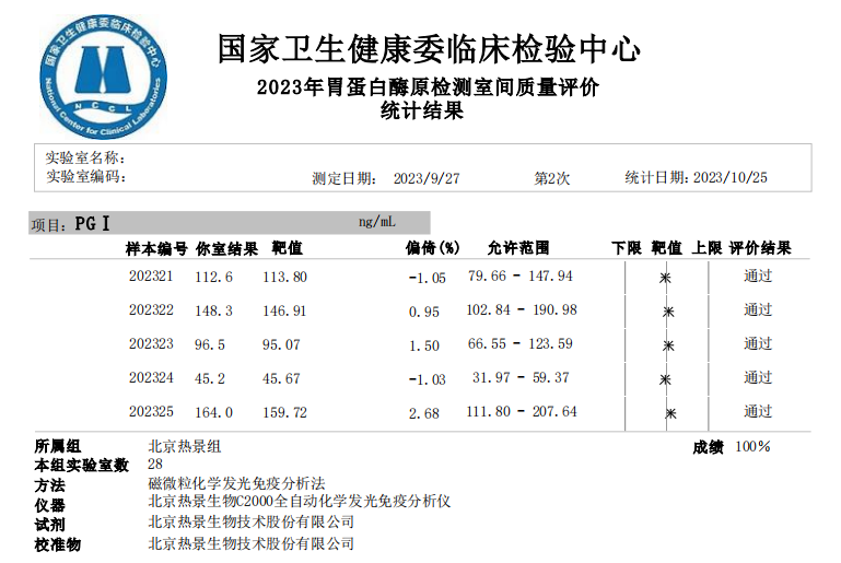 胃蛋白酶原(PGI、PGII、PGI/PGII比率)室间质评成绩单
