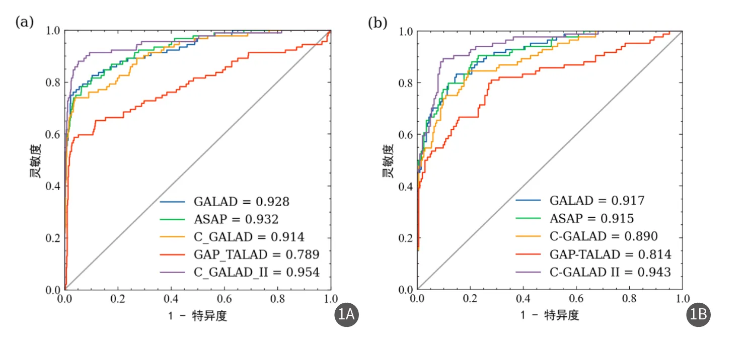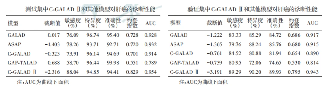 在测试集上验证C-GALAD Ⅱ所得AUC为 0.954,敏感度为88.04%,特异度为94.85%;在外部独立验证集的C-GALAD Ⅱ所得AUC为0.943,敏感度为89.29%,特异度为90.2%,性能优于其他已发表模型。