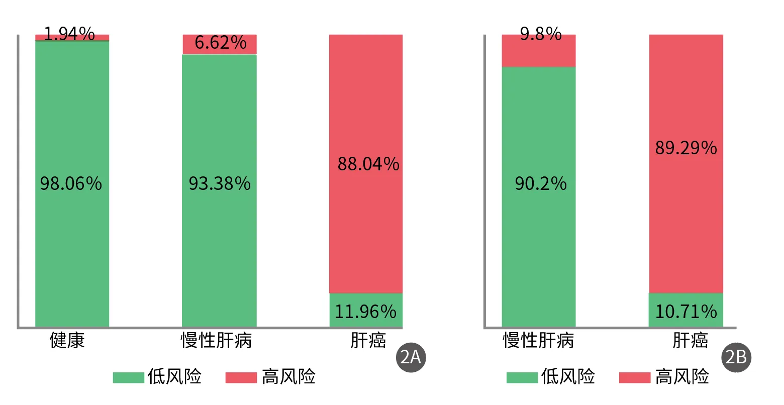 图2  C-GALAD Ⅱ模型在测试集和验证集中不同人群的预测结果分布(2A为测试集,2B为验证集)