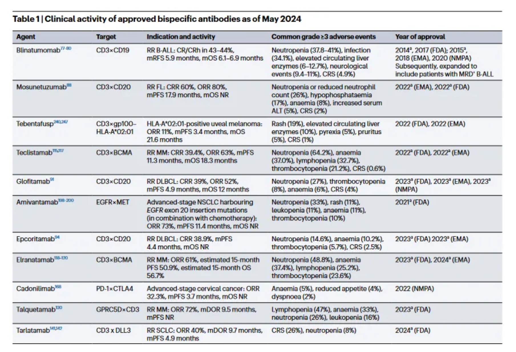 图2 截至2024年5月批准的双特异性抗体的临床试验情况