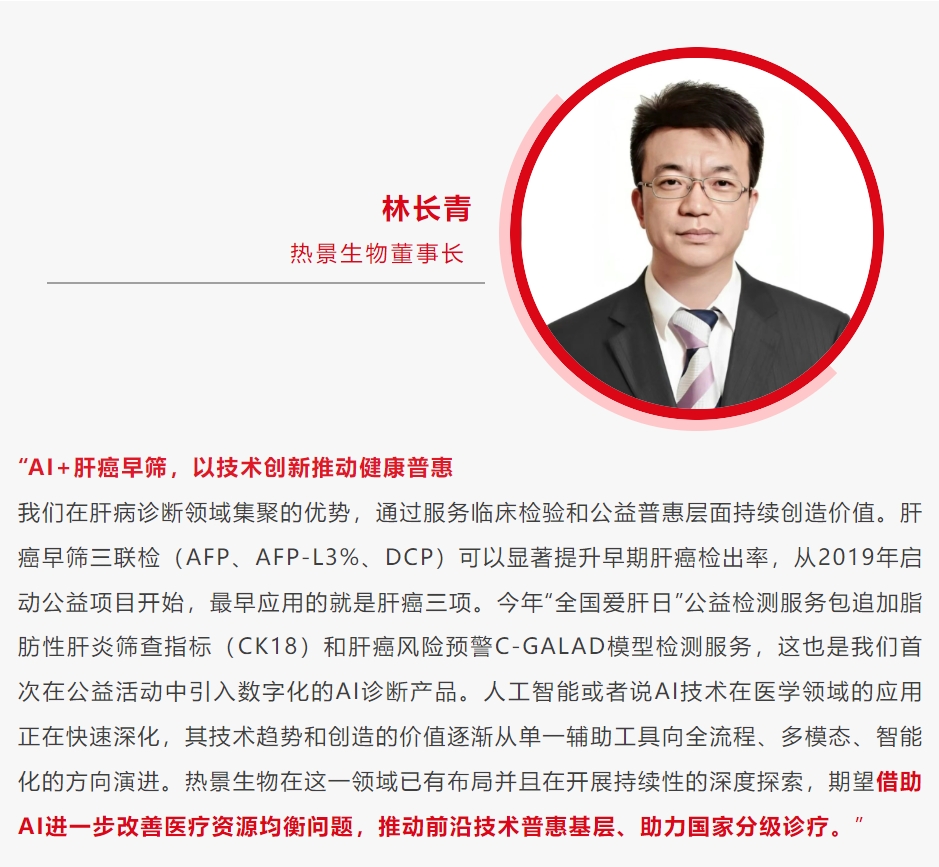 3月18日,值第25个“全国爱肝日”期间,“2025肝癌防治健康中国行——全国爱肝日”大型公益义诊活动在全国30省份近百家医院的协同下联合展开,惠及近万人次,公益健康服务包(肝癌三项、GP73、CK18-M30/M65等)由热景生物支持。2025年升级版“肝病全周期健康检测服务包”首次融合数智化AI诊断模型,探索“AI+创新诊疗”公益新模式,通过智能算法提升肝癌筛查效益,助力实现"筛查-诊断-干预"全流程精准管理,全面推动肝癌防治迈入数智化新阶段。