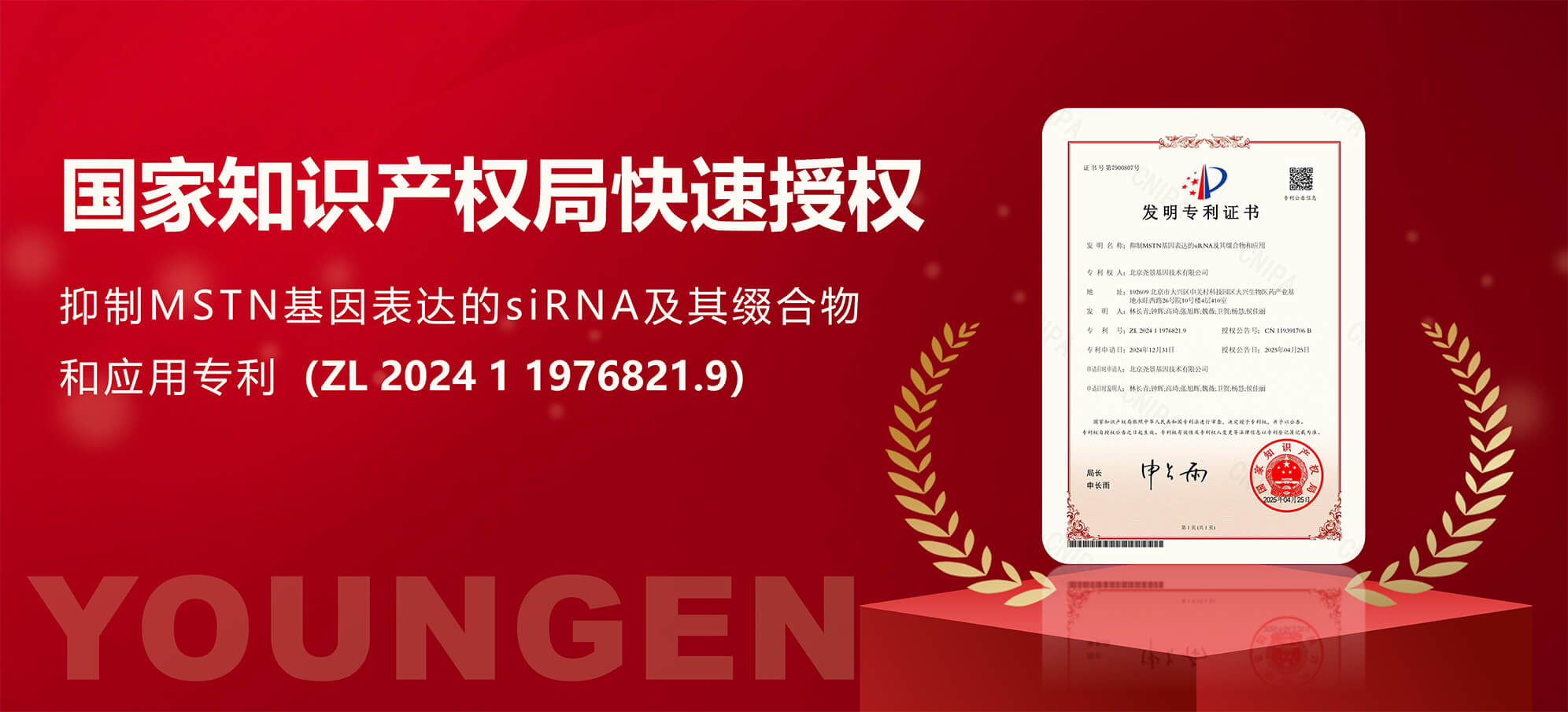 近日,热景生物参股公司北京尧景基因技术有限公司,被国家知识产权局快速授权了名为“抑制MSTN基因表达的siRNA及其缀合物和应用”专利(ZL 2024 1 1976821.9)。该专利提供一种能够抑制MSTN基因表达的siRNA分子,以期对包括MSTN基因相关的肥胖等疾病提供新的治疗方式。该项专利的快速授权基于尧景基因行业领先的序列设计修饰、靶点评估FISTTM和肝外递送STTTM技术平台。