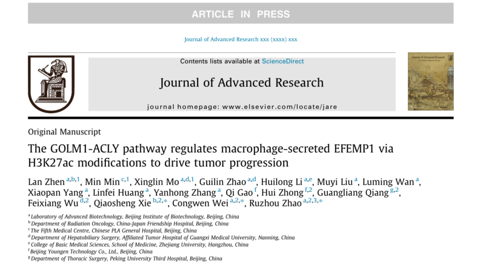 近日,热景生物参股公司北京尧景基因技术有限公司(简称“尧景基因”)联合北京生物技术研究所、中日友好医院、广西医科大学附属肿瘤医院等多家单位,在《Journal of Advanced Research》杂志发表重要研究成果,论文题为《The GOLM1-ACLY pathway regulates macrophage-secreted EFEMP1 via H3K27ac modifications to drive tumor progression》。该研究首次阐明巨噬细胞中 GOLM1-ACLY 轴通过表观遗传调控与细胞间信号传导影响肿瘤进展的分子机制,为癌症治疗提供了全新潜在靶点。