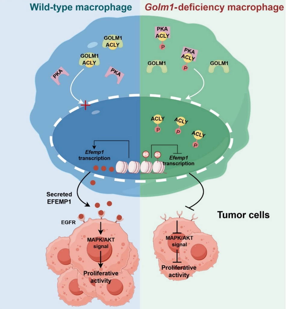 研究结果表明,GOLM1 在肿瘤相关巨噬细胞中高表达;巨噬细胞中 GOLM1 缺失可抑制肿瘤,并促进代谢重编程;本研究中首次证实,GOLM1 可与 ACLY 直接结合并干扰其在巨噬细胞中的功能。GOLM1 与 ACLY 的结合会阻碍上游蛋白激酶 A(PKA)介导的 ACLY 在丝氨酸 455 位点的磷酸化,进而导致 ACLY 活性降低;而敲除巨噬细胞中的 GOLM1基因会增强细胞核内 ACLY 的磷酸化水平,从而促进组蛋白 H3 第 27 位赖氨酸的乙酰化(H3K27ac)。多组学分析表明,H3K27 的乙酰化水平升高会进一步抑制巨噬细胞中细胞外基质(ECM)蛋白 EFEMP1 的转录与释放,进而抑制肿瘤细胞中 EGFR 的活性及其下游 MAPK 和 AKT 信号通路,最终抑制肿瘤的增殖活性。本研究首次阐明,在巨噬细胞中GOLM1通过 EFEMP1/EGFR 细胞间信号传导,影响 ACLY 介导的表观遗传调控,从而调控肿瘤增殖。这些发现提示,肿瘤相关巨噬细胞(TAMs)中的 GOLM1-ACLY 轴有望成为癌症治疗的潜在靶点。